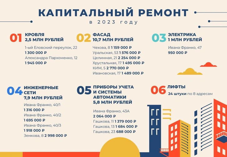 Если детально, то на перегородки, двери и люки за 2023 год ушло более 1,3 млн рублей. Кровлю и балконы смогли привести в порядок, потратив чуть более 1 млн рублей, а на электромонтажные работы направили ровно вдвое больше — 2 млн рублей.