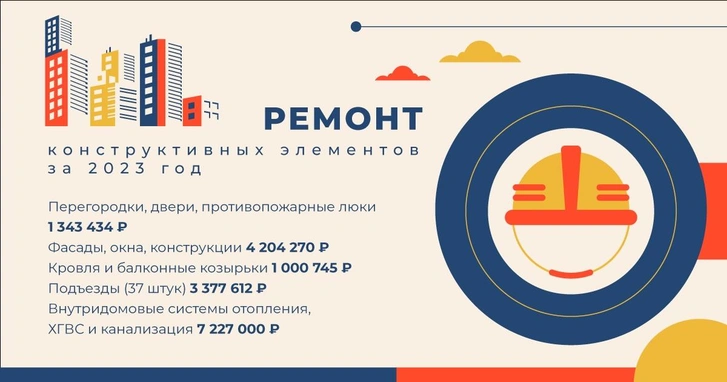 В 2023 году компания также отремонтировала конструктивные элементы в домах: ограждения и перегородки, двери, люки, подъезды, балконы, входные группы, межпанельные и межплиточные швы.