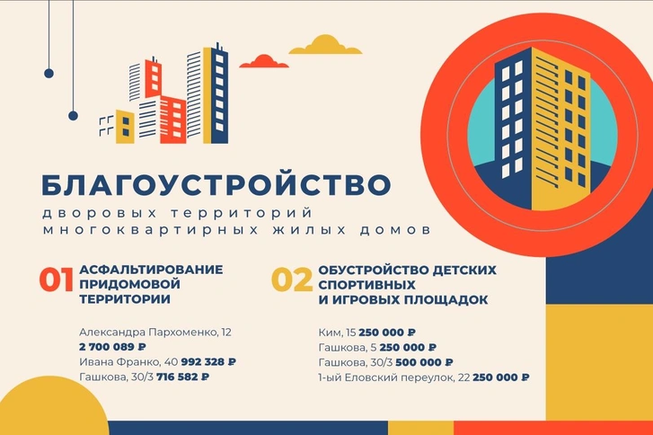 На ремонт 37 подъездов в 20 многоквартирных домах была потрачена сумма более 3,3 млн рублей. На благоустройство дворов — 1,4 млн, на детское оборудование и тренажеры — более 300 000 рублей. Еще 261 428 реализовали на ремонт придомовых ограждений.